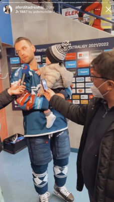 Afërdita u shpreh shumë e emocionuar, po aq edhe bashkëshorti i saj që intervistën si kapiten i skuadrës së tij të hokey, e dha me të birin në krah. “Intervista e parë e Sky”, shkroi Afërdita duke qeshur.
