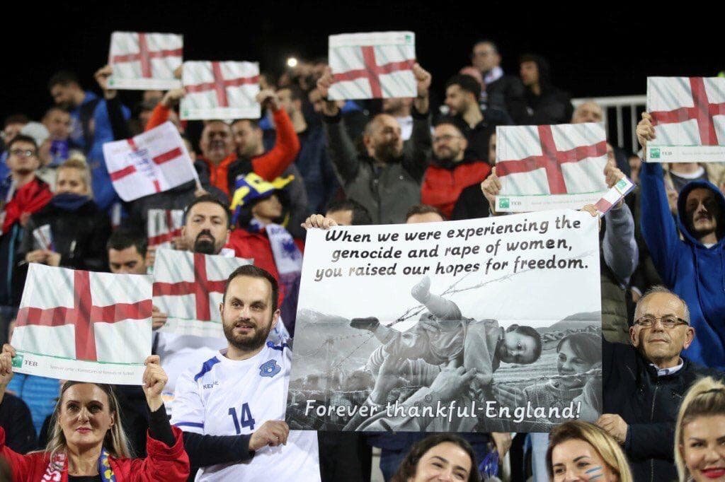 Në Prishtinë u zhvillua ndeshja Kosovë-Angli, e cila përfundoi me fitoren e anglezëve. Ajo që ka tërhequr vëmendjen e të gjithëve ka qenë mënyra sesi tifozët e Kosovës kanë mikrpitur anglezët. Me pankarta dhe flamuj të Anglisë, ata kanë shprehur mirënjohje që u kanë hapur rrugën për të emigruar drejt shtetit britanik në një kohë shumë të vështirë lufte.