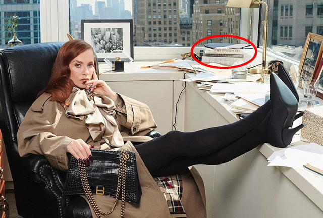 Në tavolinën e punës të aktores franceze Isabelle Huppert që pozon në zyrë duke mbajtur një Balenciaga, shfaqet emri i një artisti belg, puna e të cilit përfshin përshkrime të vegjëlve të tredhur.
