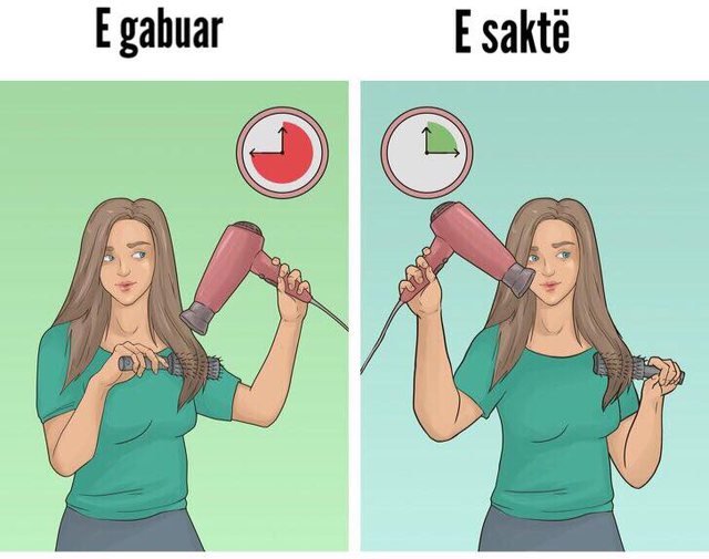 Nëse dëshironi të keni volum në flokët tuaja mos e mbani tharësen në këtë mënyrë. Krehjen e flokëve bëjeni nga lart sepse, do të keni një model më voluminoz.