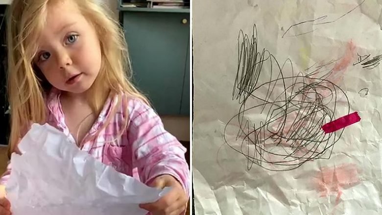 Një video e postuar nga SWNS në kanalin e saj në YouTube tregon një vajzë të lezetshme tre-vjeçare që zbulon se nëna e saj aksidentalisht hodhi një vizatim në plehra.