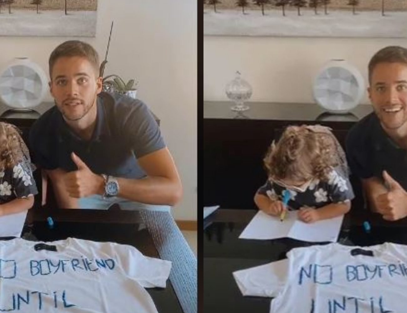 E mahnitshme është se vajza e tij jo vetëm që… firmos (duke mbajtur syze dielli për t’i dhënë stil momentit), por edhe pozon me trikon ku shkruhet që të mos gjejë partner, nën tingujt e…Champions League. Videoja që është bërë virale ka marrë shumë komente.