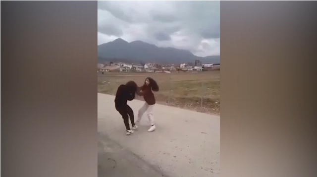 Teksa kapen për flokësh me njëra-tjetrën, bashkëmoshatarët e tyre që duhet të nxitonin për t’i ndarë dhe për t’i thënë se nuk është zgjidhja e duhur për të zgjidhur një keqkuptim, e shijonin pamjen skandaloze sikur të ishte spektakël. Vetëm pak çaste pas sherrit, një djalë u fut mes vajzave për t’i dhënë fund goditjeve. Pamjet e shpërndara janë shoqëruar me një këngë të reperave shqiptarë që flasin për “plumba” e “thyerje hunde”, të cilat po i dëgjojnë në masë të gjerë fëmijët.