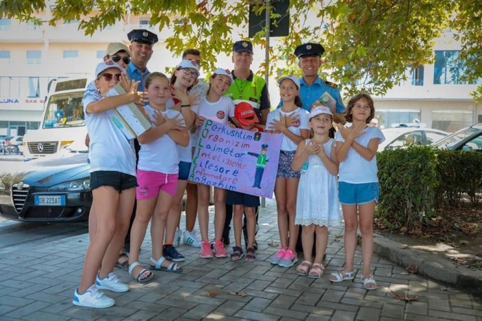 ‘Vlorë – Sot, një grup fëmijësh u kanë dhuruar shishe me ujë shërbimeve të Policisë Rrugore, duke i falënderuar për mundin dhe sakrificën në këto ditë të nxehta vere.