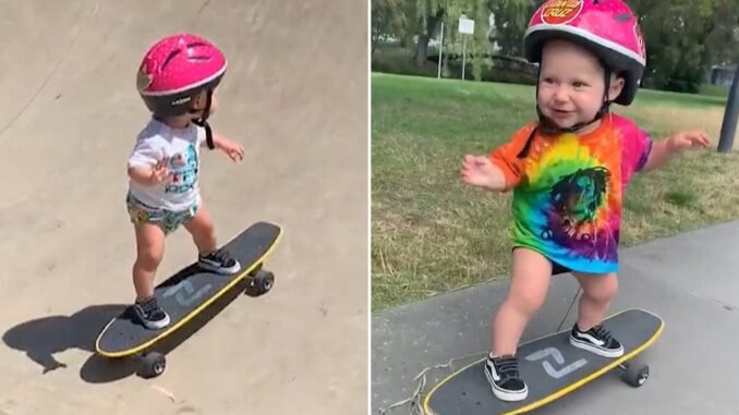 Vogëlushja 1-vjeçare nuk di të ecë, por “shkëlqen” mbi skateboard